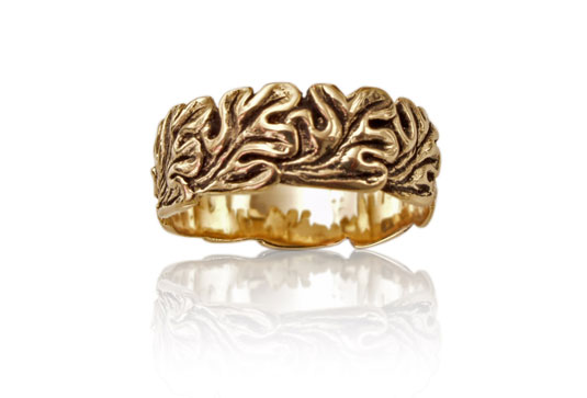 This design features a 6x4mm oval stone set within the oak leaves that encircle the band. The ring does not have rims, so it has a wonderfully organic feel. This design can accommodate a faceted or cabochon stone.Catalogue Number RS-114
