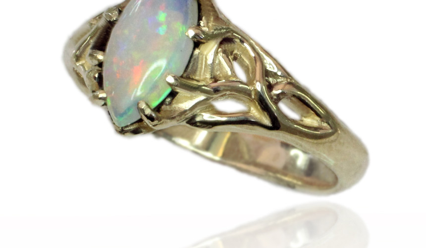 These two Mighty Oaks gently embrace, becoming united at the furthermost reaches of their branches where they merge and become one ring. The ring is open between the branches, creating this ring a delicate design yet strong band. They come together to hold up a marquis-shaped 10x5mm stone.
