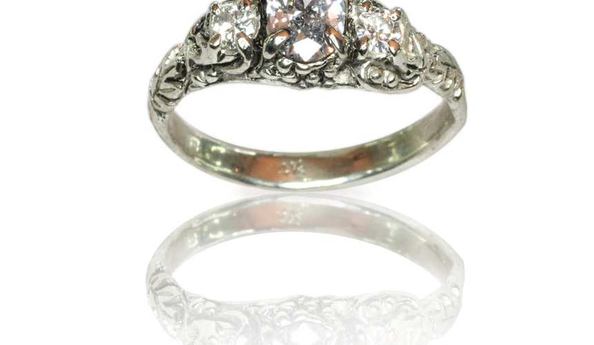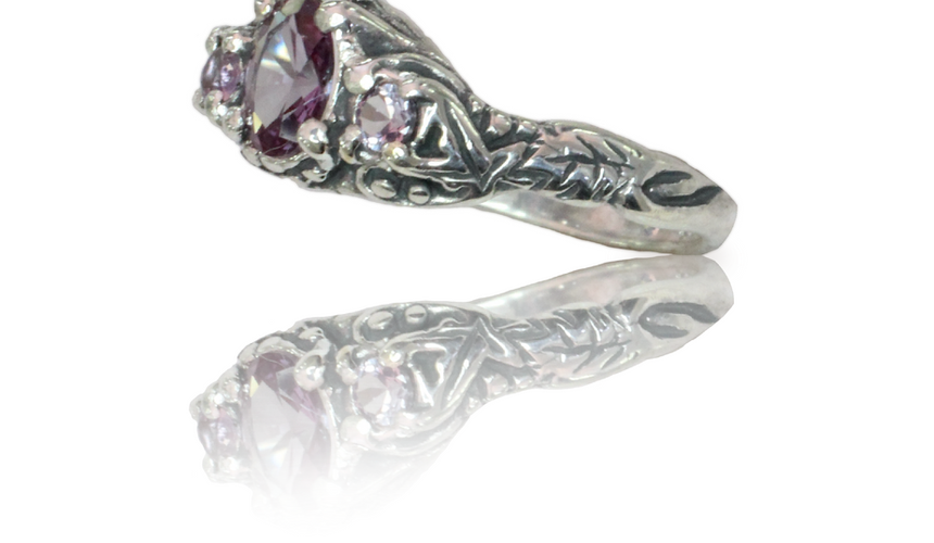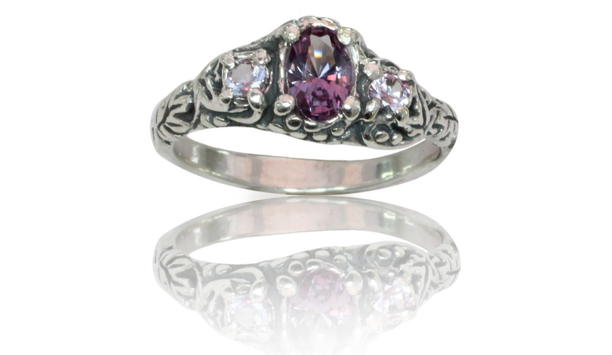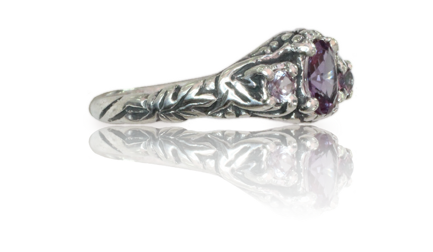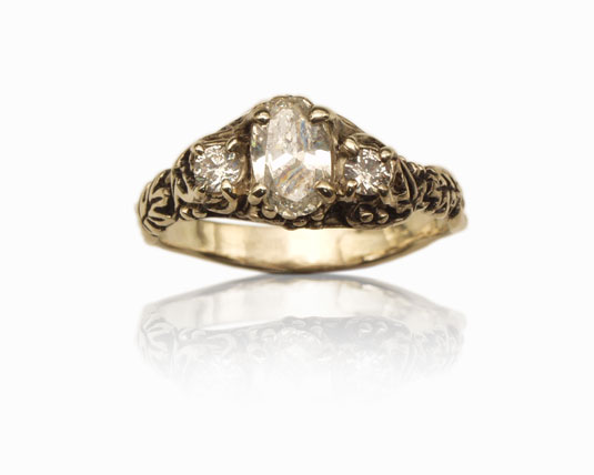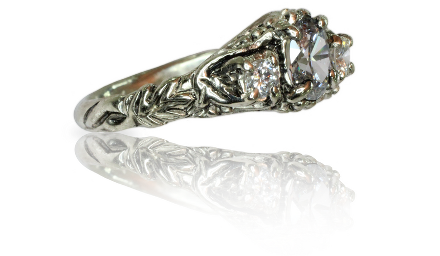 This ring, featuring a 6x4mm stone in the center, has twirling grapevines and small grapes ready for the harvest. The two side stones measure 2.5mm and add sparkle to the overall design.