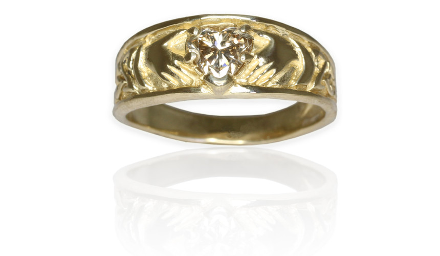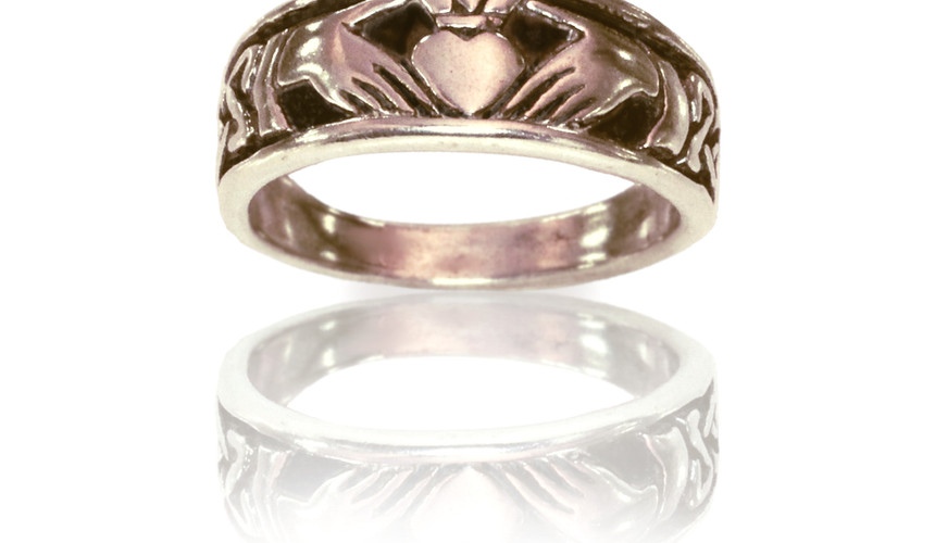 This claddagh is perfect for those who prefer a band style, but don't like the width going all the way around the finger. This piece is 7.7mm wide in the center front but tapers to a comfortable 3.65mm around the back. The sides of the design have a celtic know tapering with the ring. This one features the hands and heart as well as the crown in the center front design.