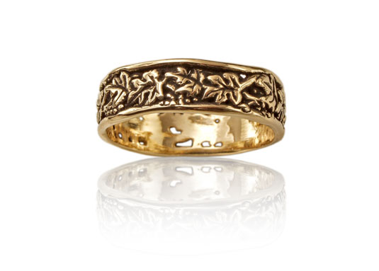 This ring is the band version of our Grapes on the Vine designs. The leaves dance amongst the ripe bunches of grapes. A true ring of celebration and festivities.