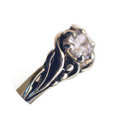 This delicate ring features a 6mm stone with a small four petal flower on one side and flowing lines and dots on the other. It was inspired by floral motifs from the Art Nouveau period. No hard lines, just flowing from one place to another. It is 9.15mm in the center front and tapers down to a 3.3mm in the back of the band.