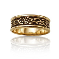 This design features a 4mm stone nestled within our Forget-me-Nots and Ivy wide band. The raised rails add to the substantial feel of this ring, making it perfect for anyone who like a little heft to their jewelry or works with their hands. It is 8.3mm wide all the way around the band.