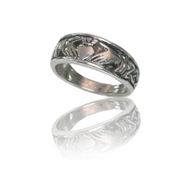 This claddagh is perfect for those who prefer a band style, but don't like the width going all the way around the finger. This piece is 7.7mm wide in the center front but tapers to a comfortable 3.65mm around the back. The sides of the design have a celtic know tapering with the ring. This one features the hands and heart as well as the crown in the center front design.
