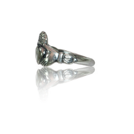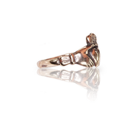 This here is the traditional claddagh, with a solid heart, two defined hands, and an imperial crown topping the lot. It measures 11.2mm in the center front and 2.7mm in the band.
